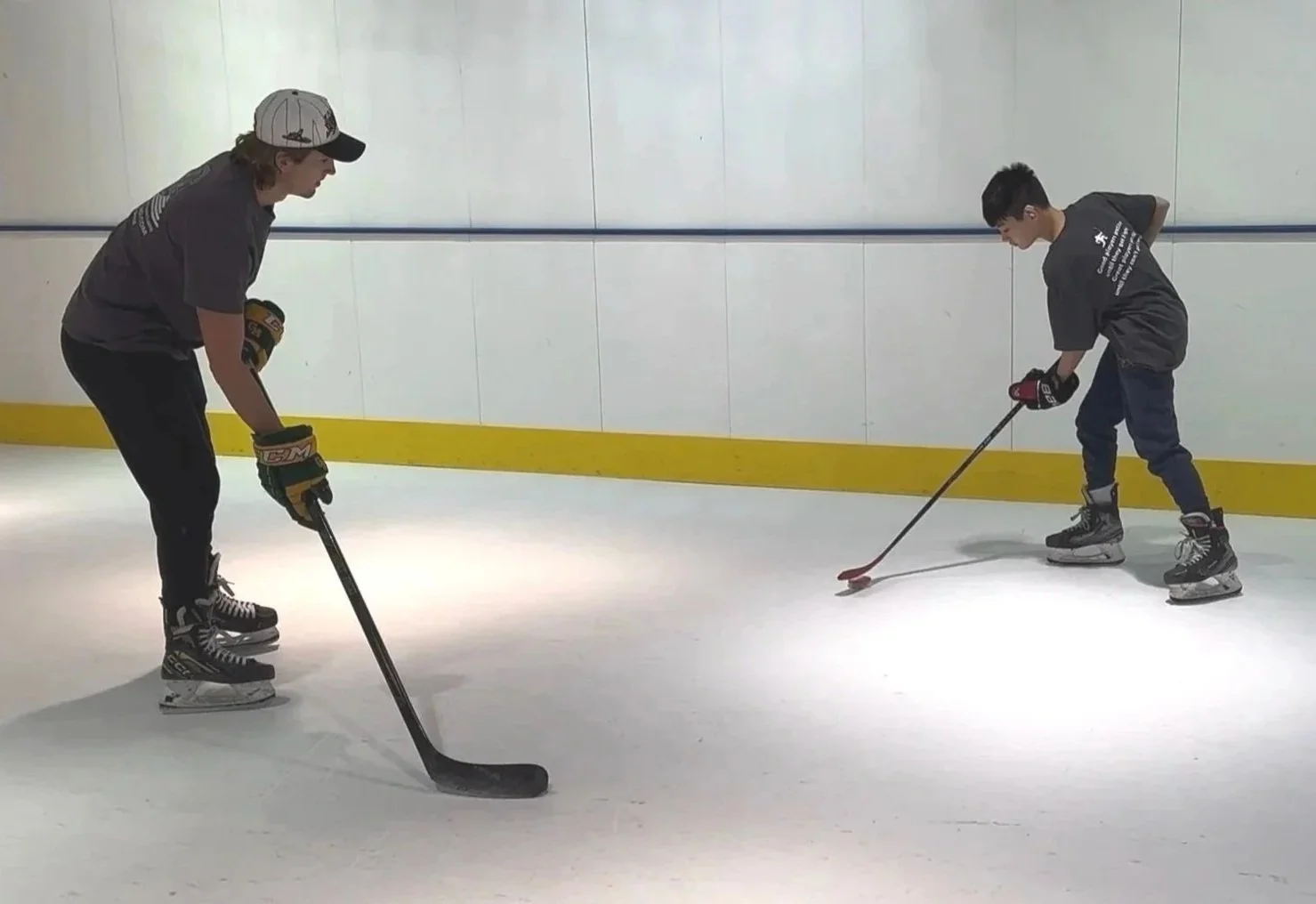 Coach-led sessions develop soft hands and puck confidence through progressive drills. Athletes start stationary, building proper grip, quick touches, and control. From there, they advance to lateral crossover movements — stepping side-to-side while handling the puck to simulate game-like pressure and movement. As players progress, drills incorporate our stickhandling aids on synthetic ice, challenging athletes to carry the puck in motion, attack obstacles, and react with creativity. With a 1:4 coach-to-player ratio, each skater gets the feedback and reps needed to elevate their puck control and become harder to defend.